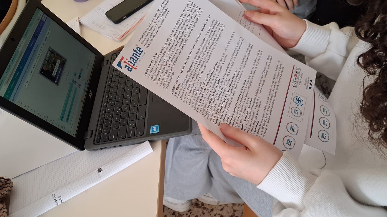 Dai volti interrogativi ma con espressione attenta, alla curiosità di sapere, approfondire e conoscere cosa fa e come lavora una cooperativa sociale. Anche per l'anno scolastico 2025/2026, Aliante Cooperativa Sociale si è messa in gioco confrontandosi con i ragazzi nel progetto “BellaCoopia - Scuola 2030” - l’iniziativa, nata dalla sinergia tra Legacoop Estense e il Gruppo SAE, in cui protagoniste sono le scuole superiori di Modena e Ferrara in un percorso innovativo che unisce auto-imprenditorialità, sostenibilità e giornalismo - per illustrare alla classe 3^G del Liceo “Carlo Sigonio” (24 studentesse e studenti) di Modena le peculiarità che contraddistinguono il suo operato quotidiano.