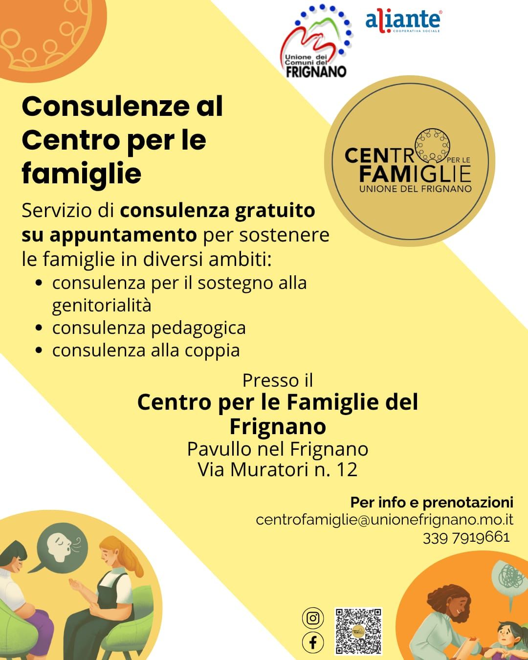 Novembre si si profila con un calendario fitto di appuntamenti al Centro per le Famiglie del Frignano gestito dagli operatori di Aliante Cooperativa Sociale. Dopo l'estate e due mesi con iniziative molto partecipate da parte di famiglie e ragazzi, sono numerose le attività gratuite messe in calendario nei diversi Comuni dell’Unione del Frignano, proposte dal centro per bambini, ragazzi e genitori. Dai laboratori creativi per i più piccoli, al torneo di bigliardino a scuola. E poi ancora il tema della gravidanza, tra attesa, post parto, alimentazione e allattamento. Quindi il "salottino" per neo mamme, papà nonni e zii, e lo spazio baby con attività di guidate e gioco, fino ai cambiamenti che avvengono nella pubertà. Un'ampia e diversificata offerta - che comprende anche l'incontro tra mamme che provengono da altri Paesi, e a cui si aggiungono lo spazio giovani, il percorso di mediazione famigliare, la formazione volta a prevenire le situazioni di fragilità famigliari - pensata per rispondere ai bisogni educativi e di socialità delle famiglie del territorio. Sopra e di seguito il programma dettagliato.