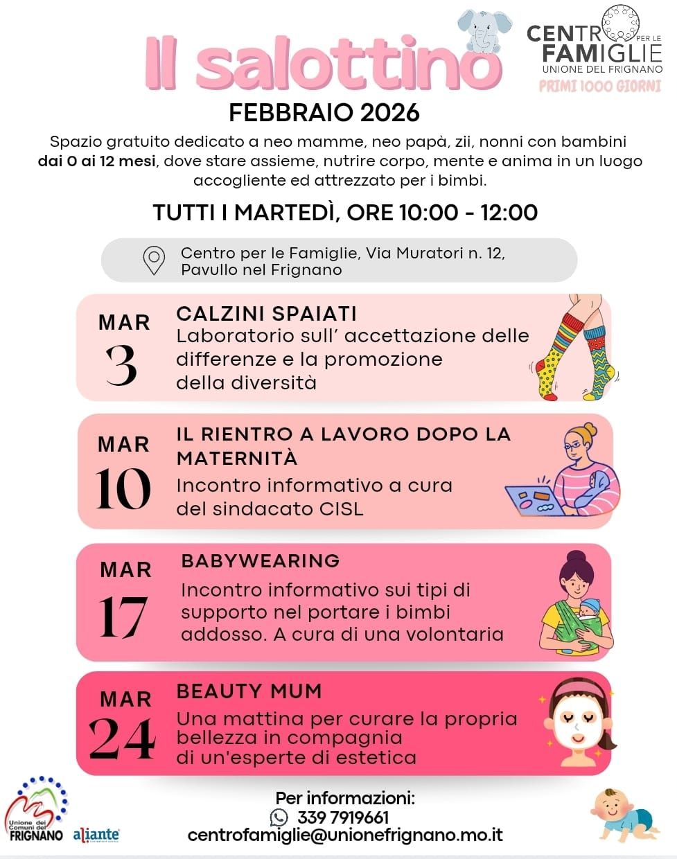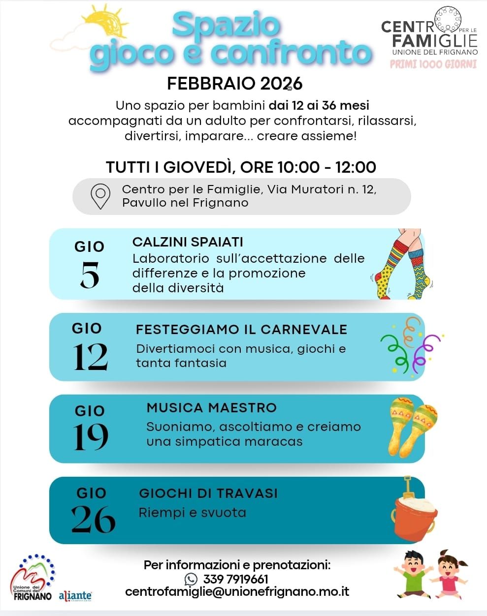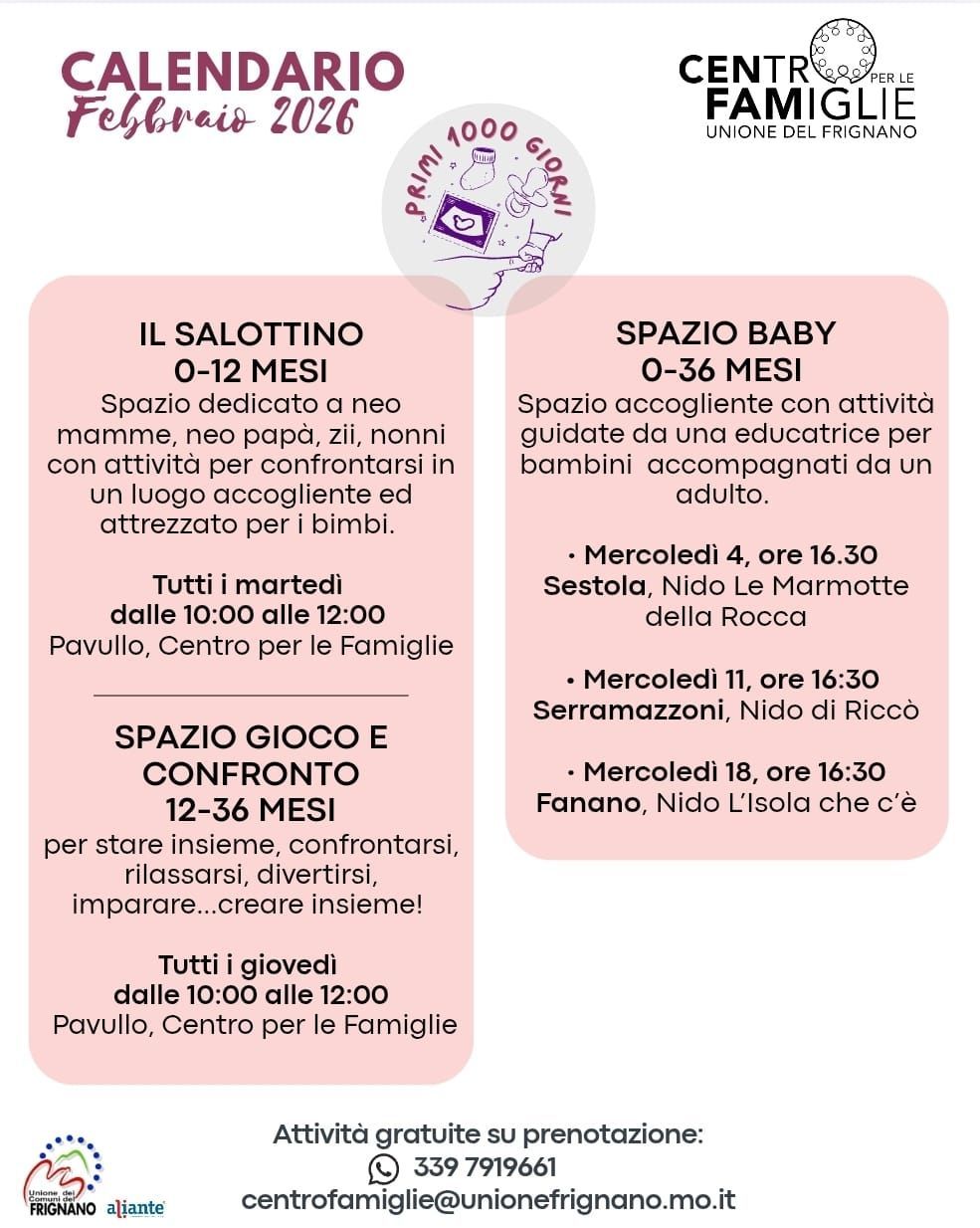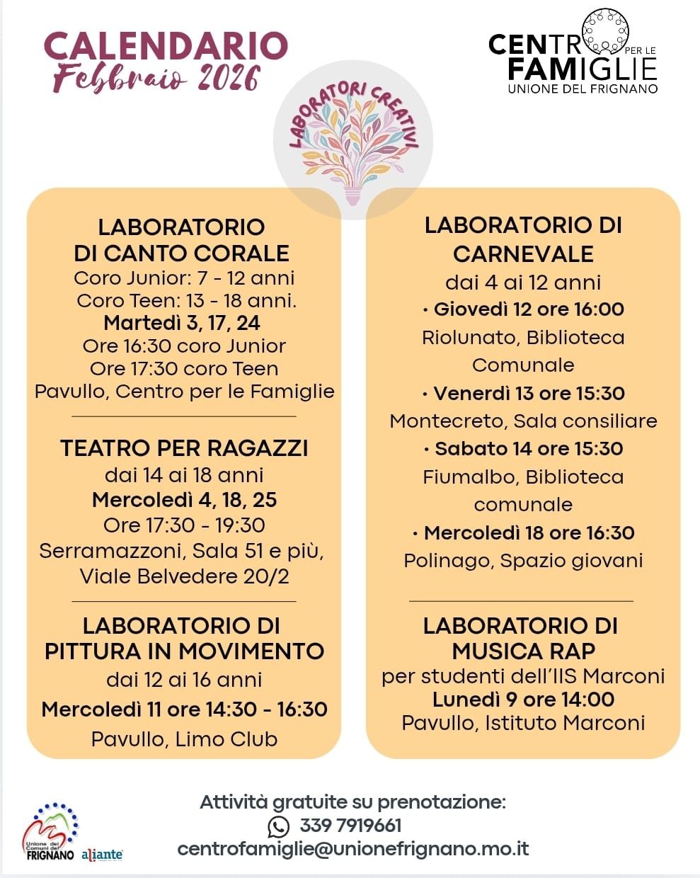 È un ricco calendario di attività gratuite per bambini, ragazzi, giovani e famiglie, quelle in programma a febbraio 2026, al Centro per le Famiglie dell’Unione del Frignano. Tutte pensate e messe a punto – anche grazie al nostro contributo - per accompagnare le diverse fasi della crescita, sostenere la genitorialità e favorire il benessere relazionale e sociale.