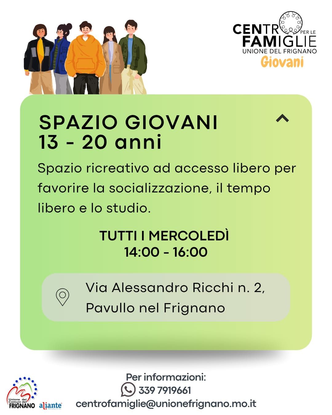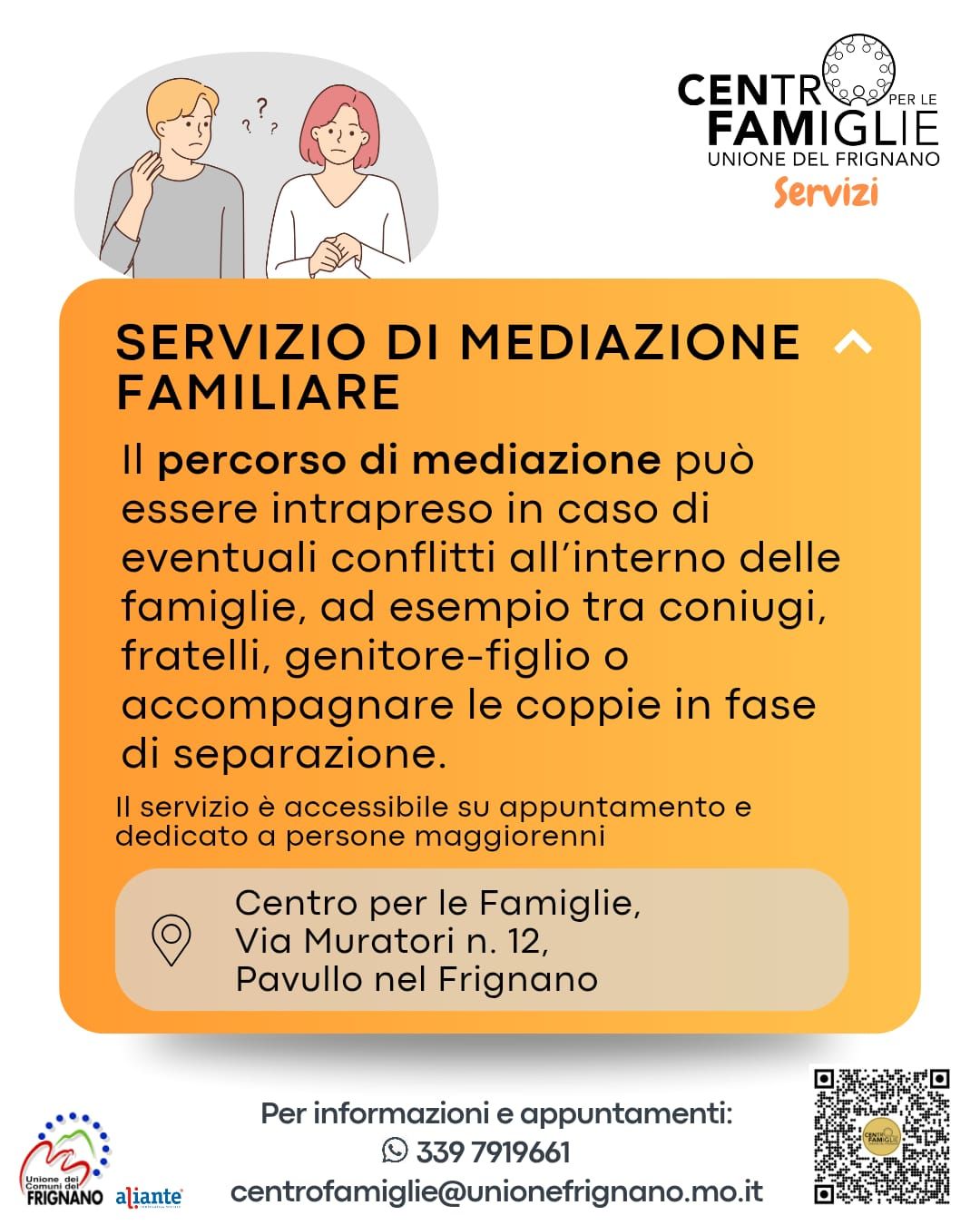 Il servizio è dedicato alle famiglie residenti nel territorio dell’Unione dei Comuni del Frignano, offrendo ascolto, sostegno e occasioni di incontro per affrontare, insieme, le piccole e grandi sfide della vita quotidiana.