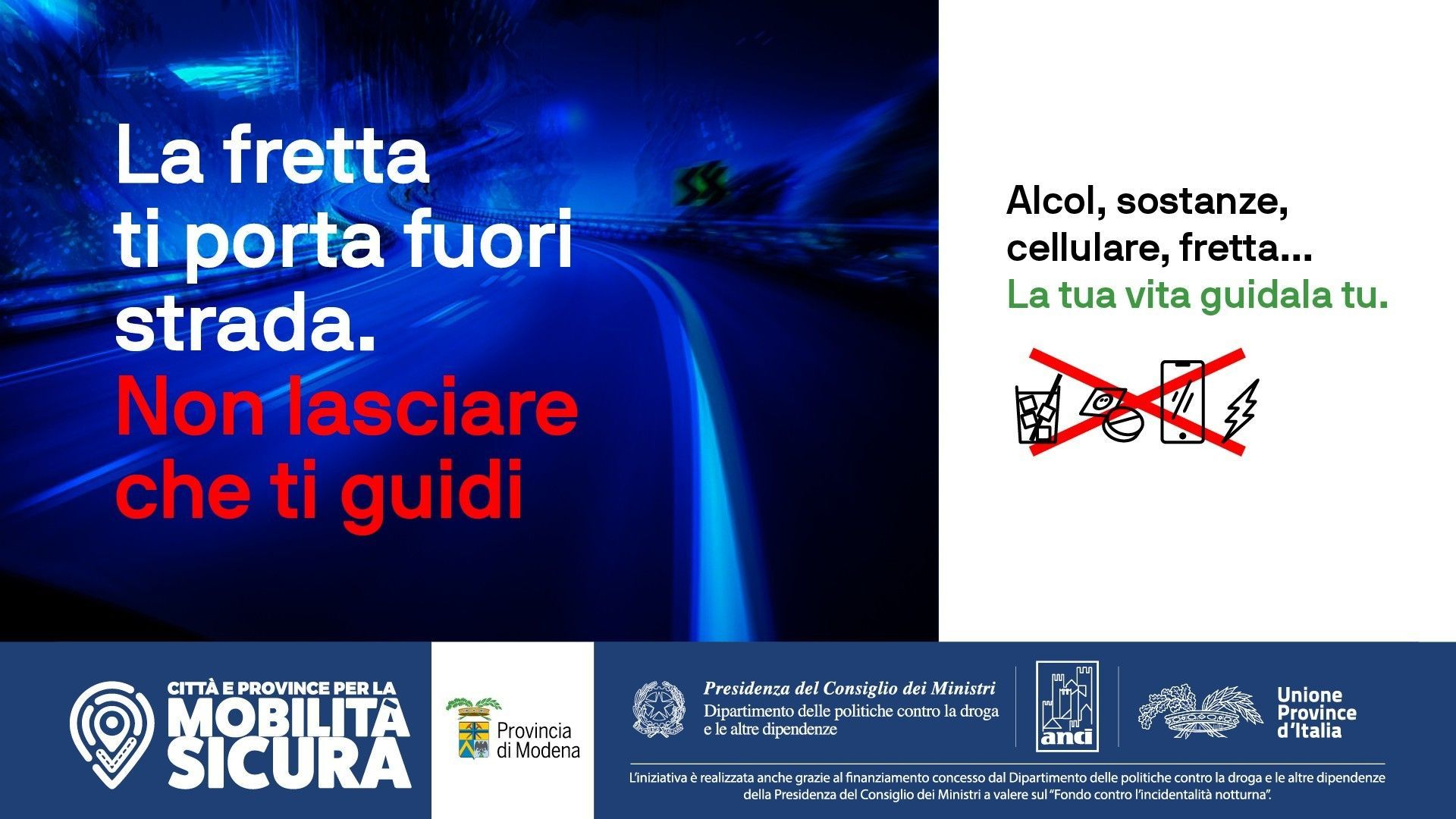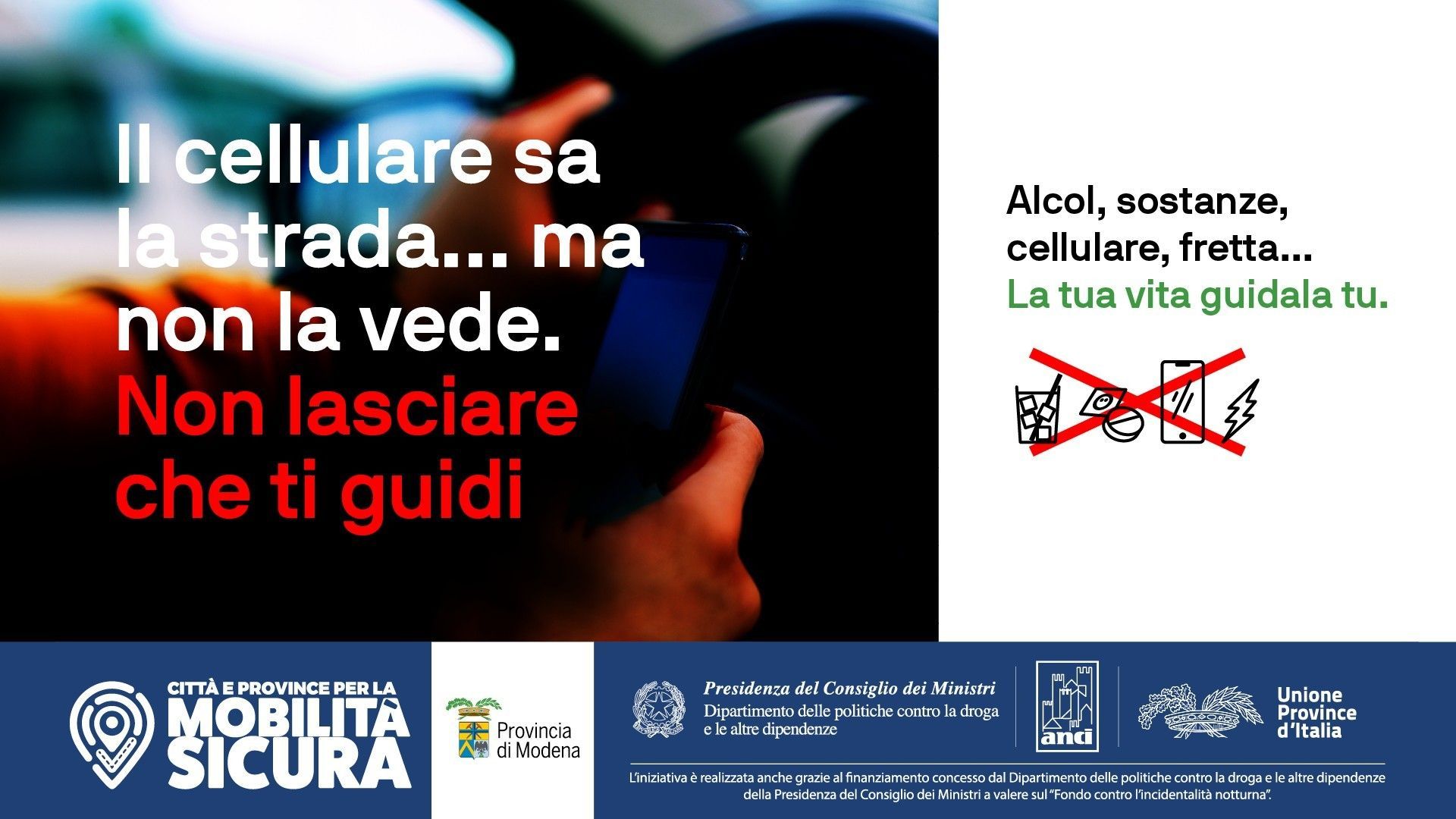 Il progetto fa parte del bando nazionale promosso dall’Unione Province Italiane “Mobilità Sicura”, finanziato con il Fondo contro l’incidentalità notturna gestito dal Dipartimento per le politiche antidroga della Presidenza del Consiglio dei Ministri, vinto dalla Provincia di Modena, ottenendo 100mila euro di finanziamento, con l’obiettivo prioritario della riduzione dell’incidentalità stradale correlata all’uso di alcol e droga attraverso la formazione delle giovani generazioni.